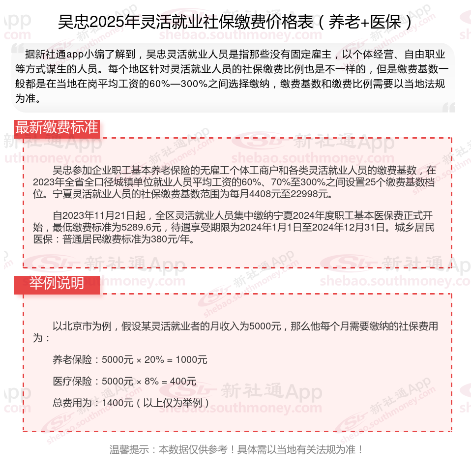 那么,吴忠自己社保一个月多少钱?根据新社通app-社保缴费查询工具提供的2025社保缴费标准详情数据: