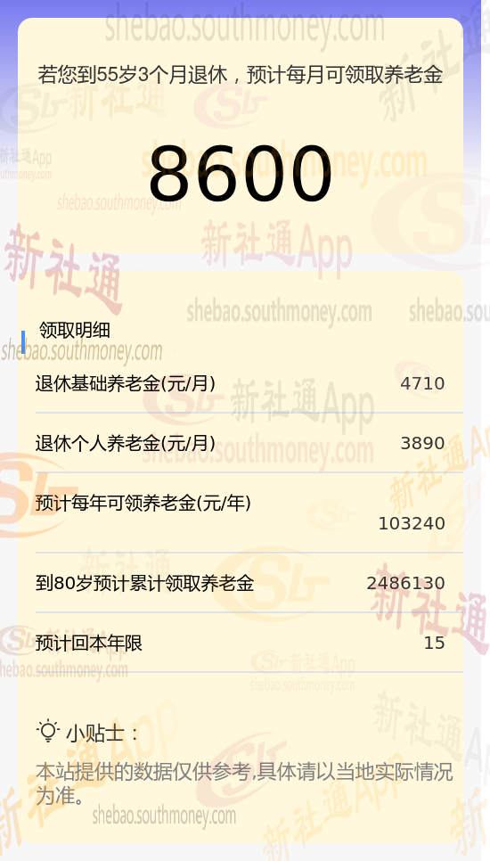 个人养老金:个人账户养老金=个人账户储存额÷计发月数(计发月数根据退休年龄和当时的人口平均寿命来确定。计发月数略等于(人口平均寿命-退休年龄)X12。目前50岁为195、55岁为170、60岁为139,不再统一是120了)。通过公式计算出每月大约3890元。