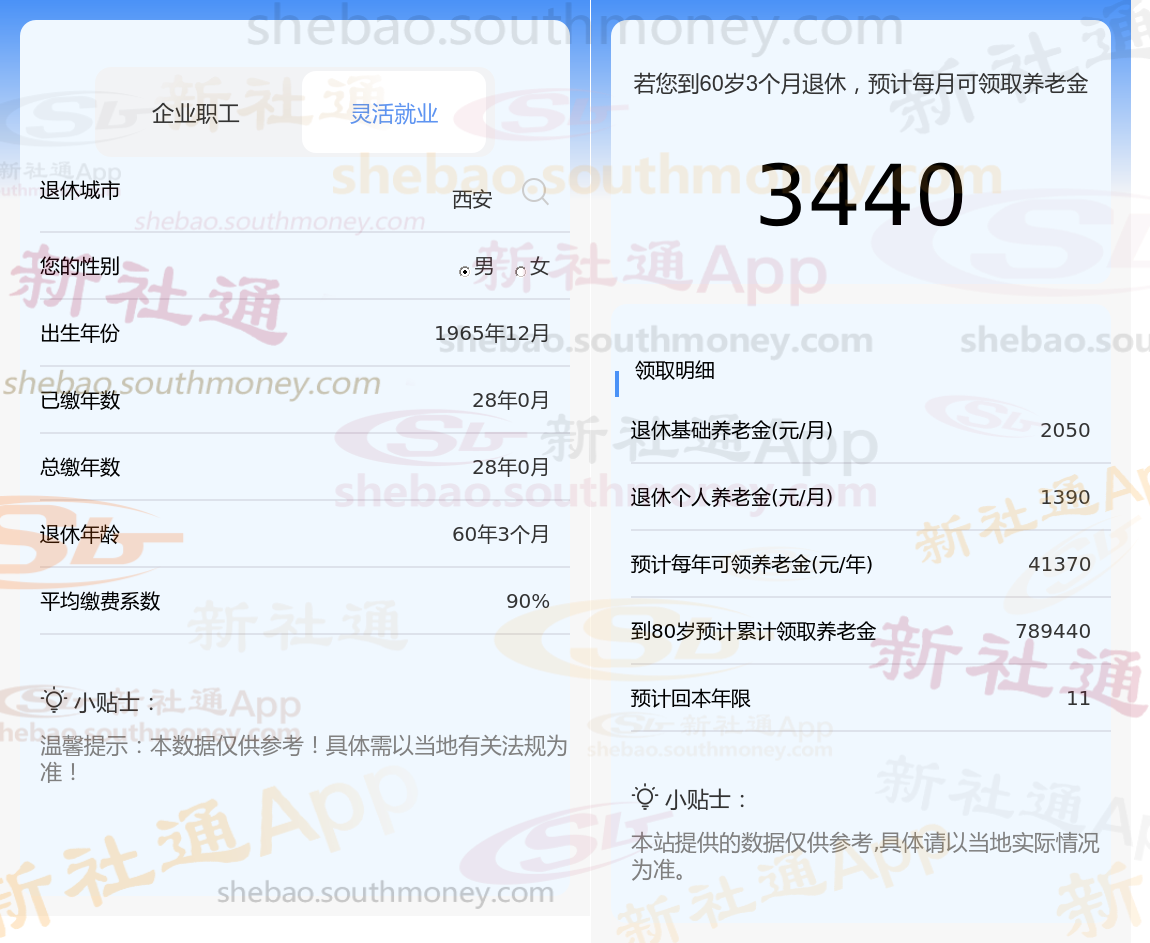 退休城市:西安,性别:男,出生年份:1965,总缴年数28年,缴费档次:90%,新社通app养老金计算器所得: