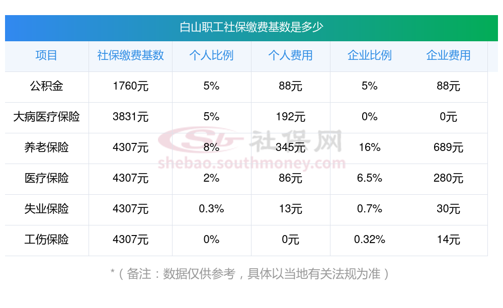 白山缴费社保比例一览 社保公司和个人各交多少?下表是2023-2024年白山社保费用明细参考,新社通app-社保缴费查询工具提供的最新数据如下:
