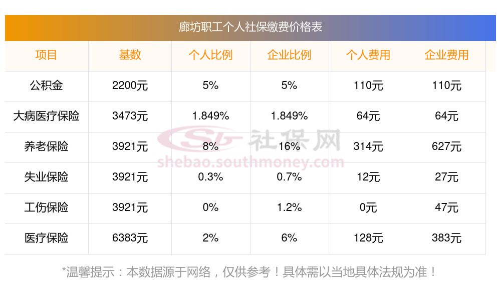 2025年廊坊社保缴费多少钱?下表是2023-2024年廊坊社保费用明细参考,新社通app-社保缴费查询工具提供的最新数据如下: