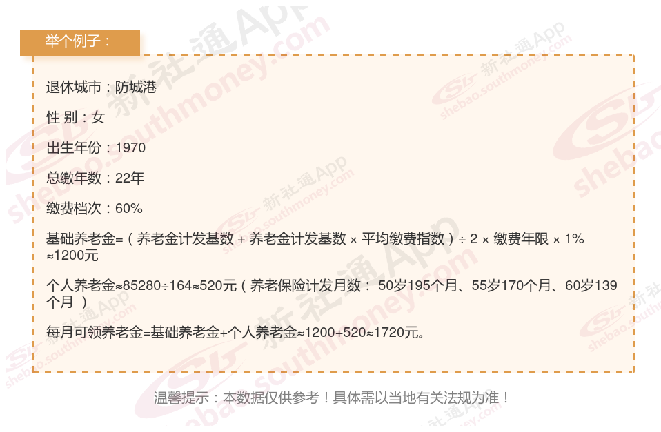 个人档案:女性,1970年出生,防城港退休职工,社保缴费22载,档次60%。
