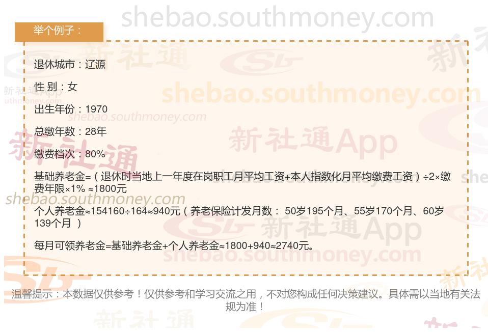 社保按80%档次缴费的朱某,辽源城市退休,出生于1970年,工龄28年,女性。岁月流转,她终于迎来了自己的退休年龄。根据新社通app养老金在线计算器计算所得:
