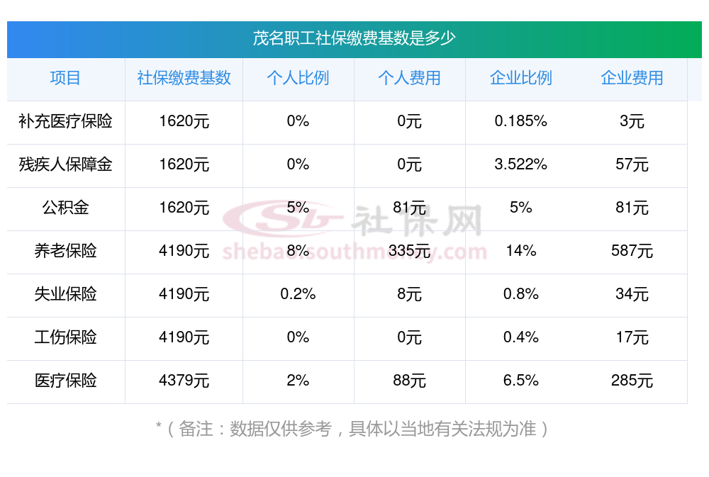 茂名缴费社保比例一览 社保公司和个人各交多少?下表是2024-2025年茂名社保费用明细参考,新社通app-社保缴费查询工具提供的最新数据如下: