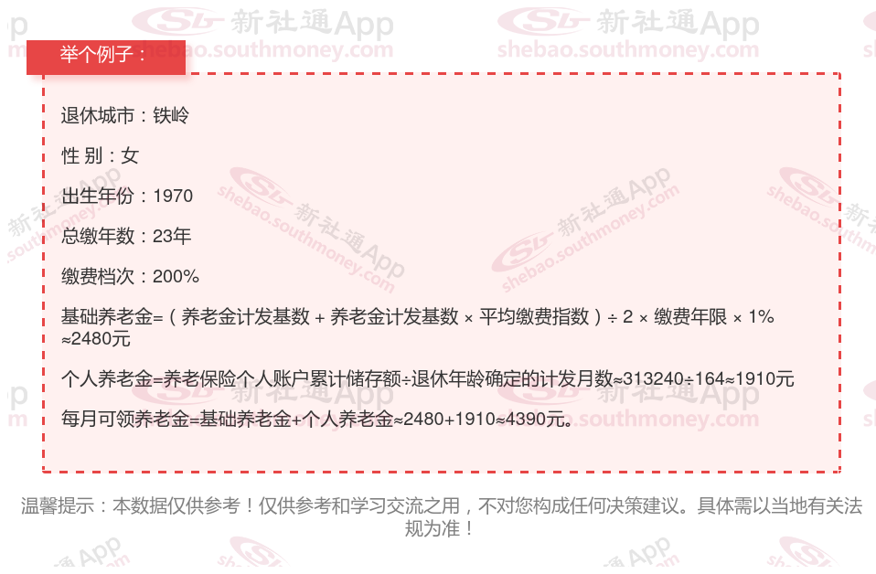退休城市:铁岭,性别:女,出生年份:1970,总缴年数23年,缴费档次:200%,新社通app养老金计算器所得: