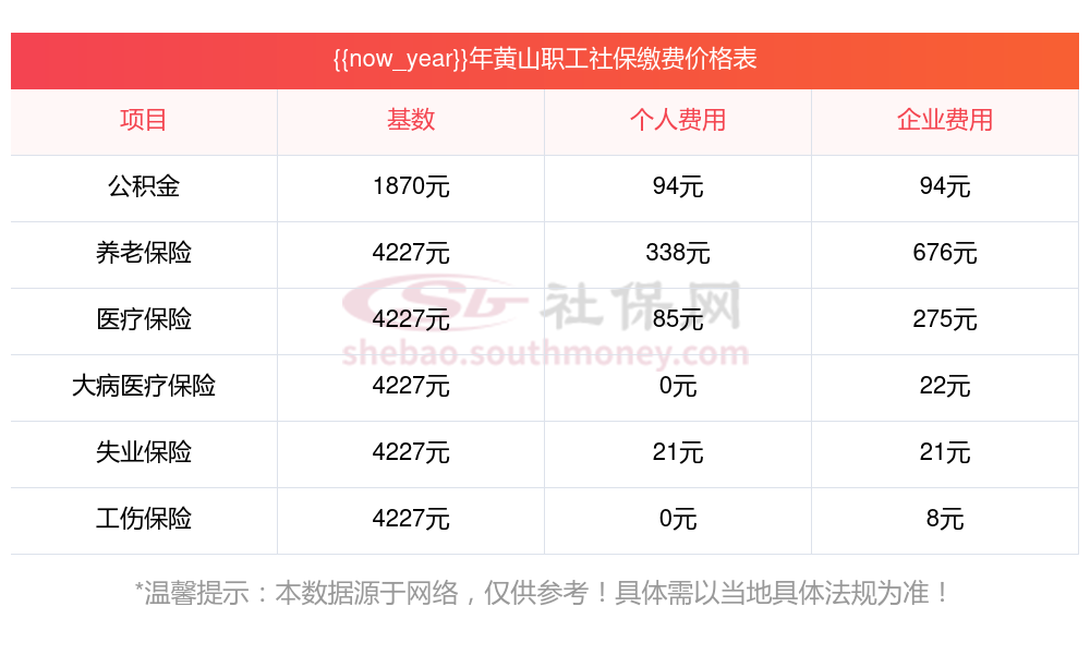 2025年黄山社保缴费多少钱?下表是2024-2025年黄山社保费用明细参考,新社通app-社保缴费查询工具提供的最新数据如下: