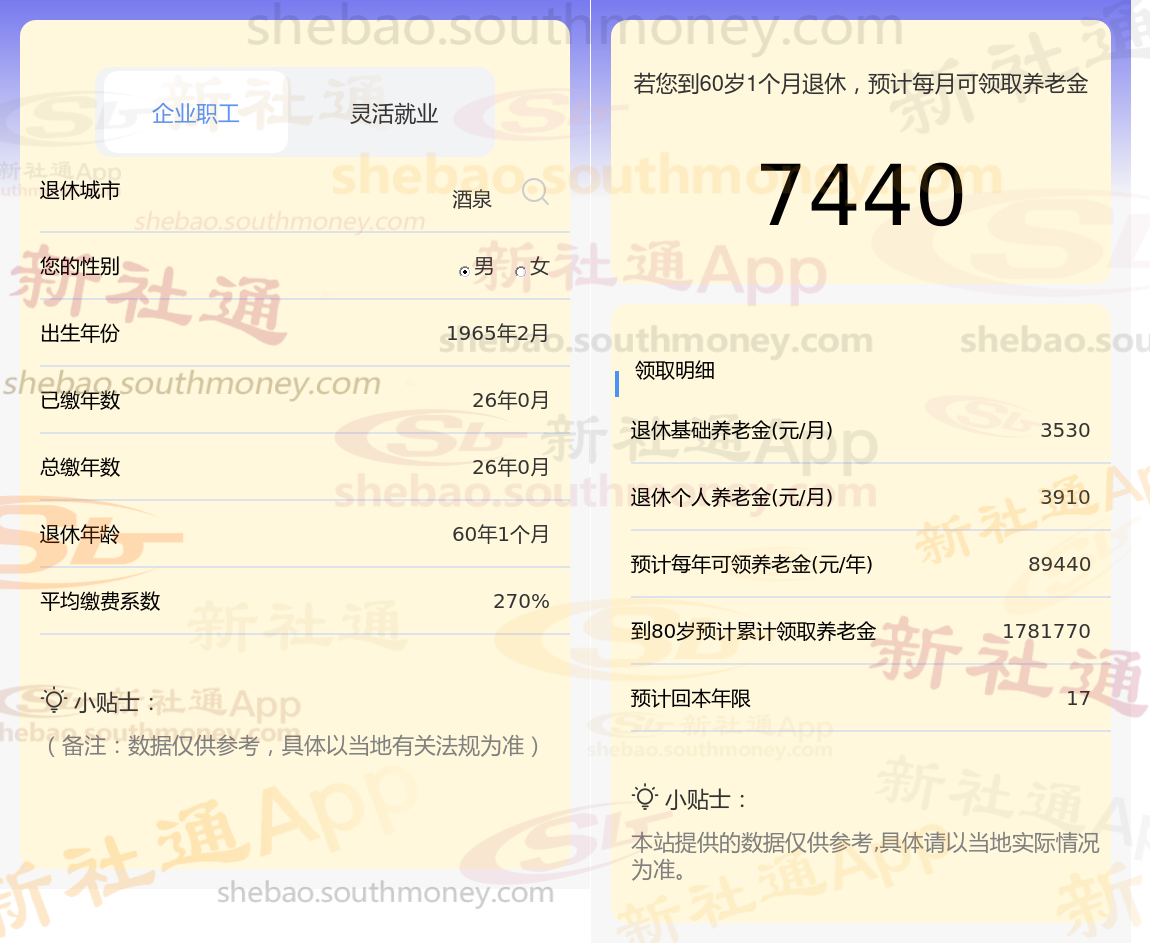 康某,酒泉人,1965年出生,工龄26年,男性,缴费档次按270%。岁月流转,他终于迎来了自己的退休时光。借助新社通app养老金在线计算器计算所得: