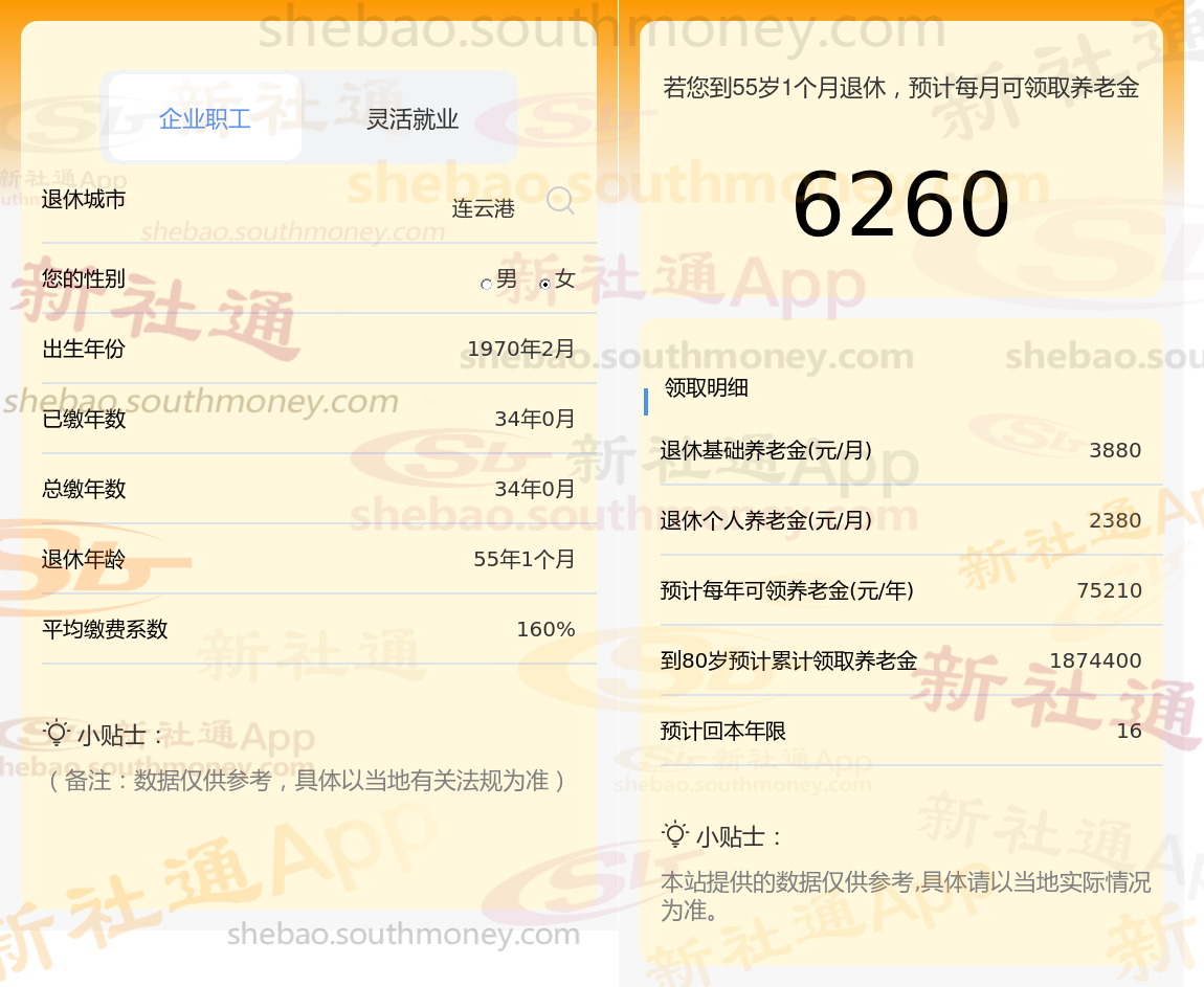 个人档案:女性,1970年出生,连云港退休职工,社保缴费34载,档次160%。