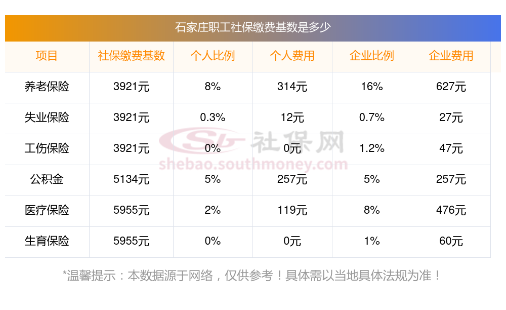 2025年石家庄5险缴费标准,2025年石家庄社保缴费多少钱?下表是2025年石家庄社保费用明细参考,新社通app-社保缴费查询工具提供的最新数据如下: