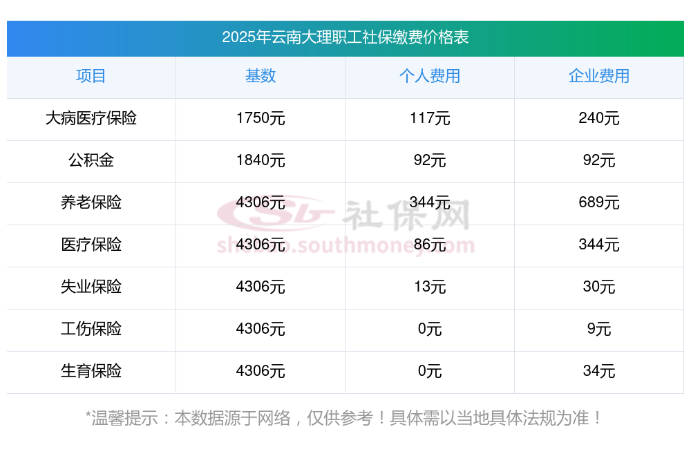 2025年云南大理社保缴费多少钱?下表是2024-2025年云南大理社保费用明细参考,新社通app-社保缴费查询工具提供的最新数据如下: