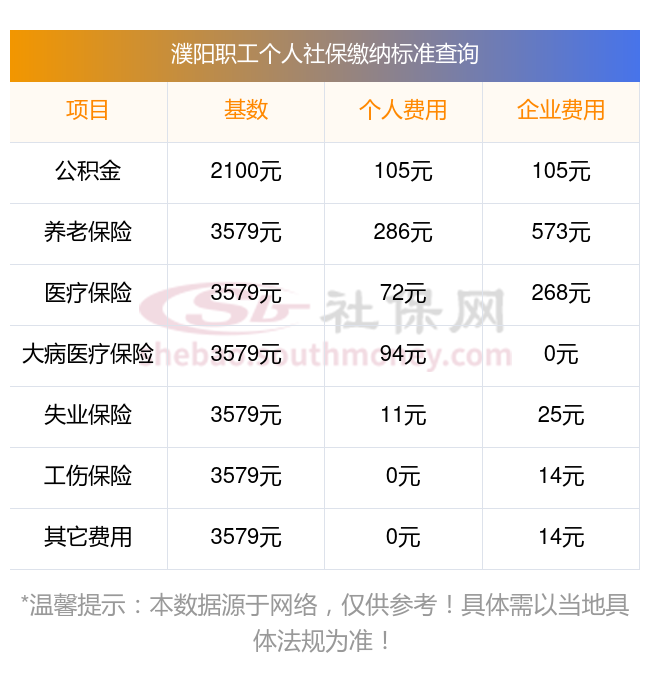 濮阳五险一金交多少钱一个月?下表是2024-2025年濮阳社保费用明细参考,新社通app-社保缴费查询工具提供的最新数据如下: