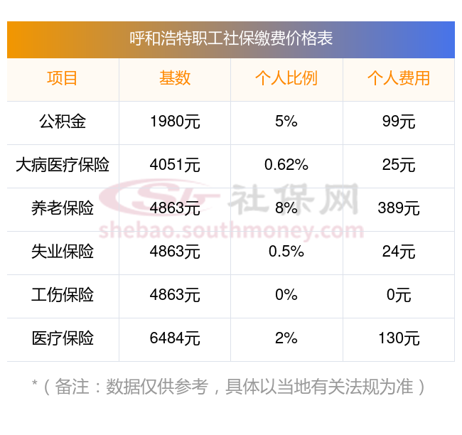 2025年呼和浩特社保缴费最低基数及个人和单位具体是多少钱?下表是2025年呼和浩特社保费用明细参考,新社通app-社保缴费查询工具提供的最新数据如下: