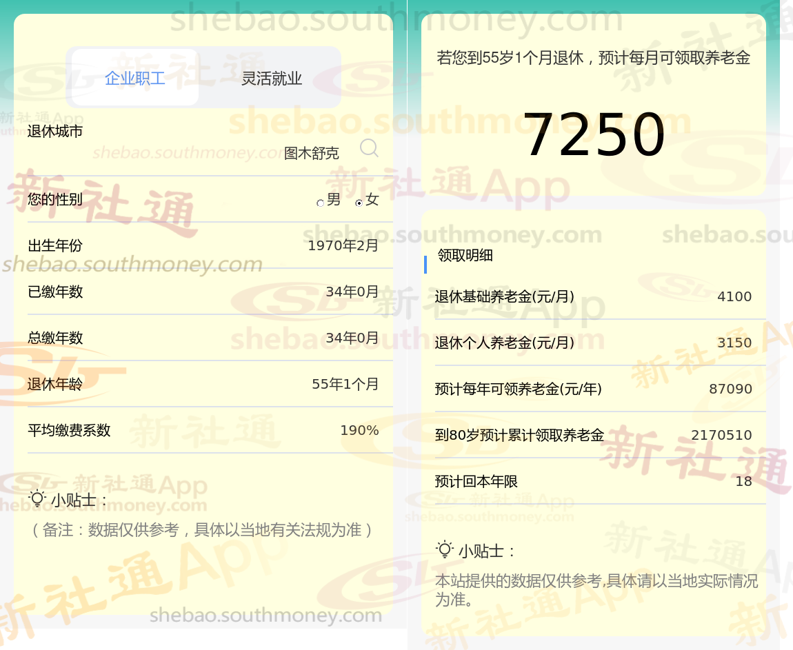 个人基础信息:女性,1970年出生,图木舒克退休人士,拥有34年的缴费年限,缴费档次为190%。