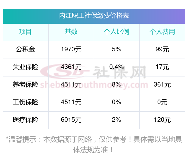 2025年内江五险缴费标准是多少,2025年内江社保缴费多少钱?下表是2025年内江社保费用明细参考,新社通app-社保缴费查询工具提供的最新数据如下: