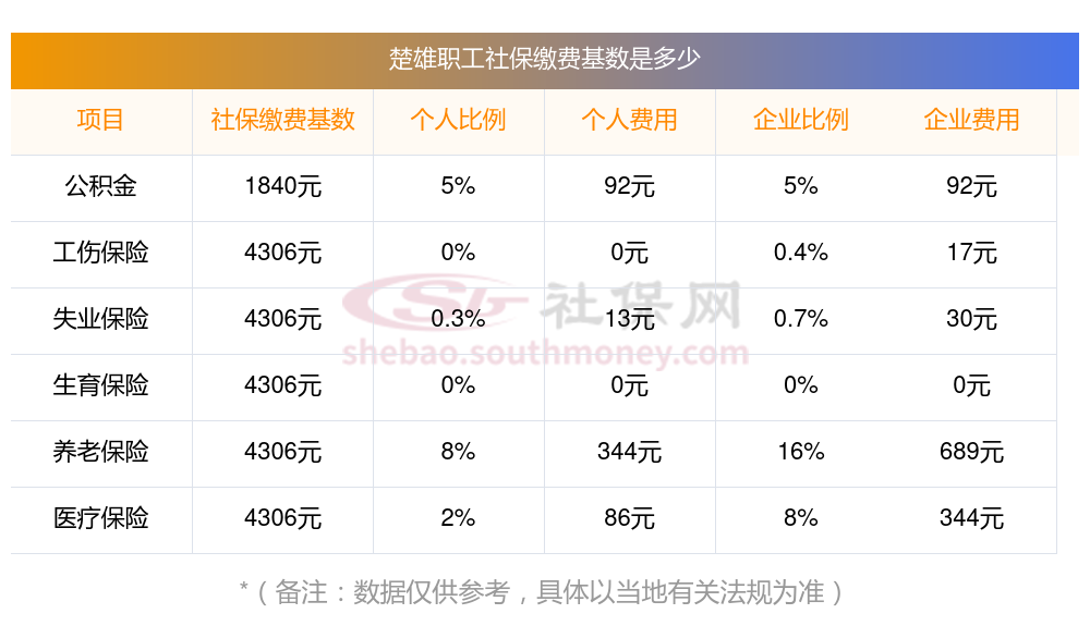 2025年楚雄5险缴费标准,2025年楚雄社保缴费多少钱?下表是2025年楚雄社保费用明细参考,新社通app-社保缴费查询工具提供的最新数据如下: