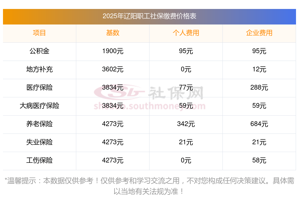 2025年辽阳五险缴费标准是多少,2025年辽阳社保缴费多少钱?下表是2025年辽阳社保费用明细参考,新社通app-社保缴费查询工具提供的最新数据如下: