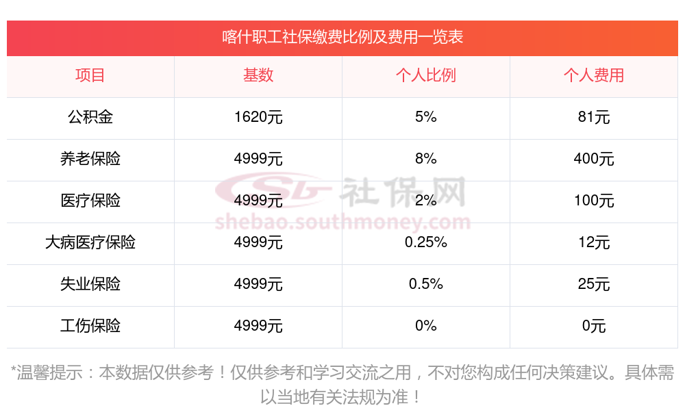 喀什五险一金交多少钱一个月?下表是2024-2025年喀什社保费用明细参考,新社通app-社保缴费查询工具提供的最新数据如下: