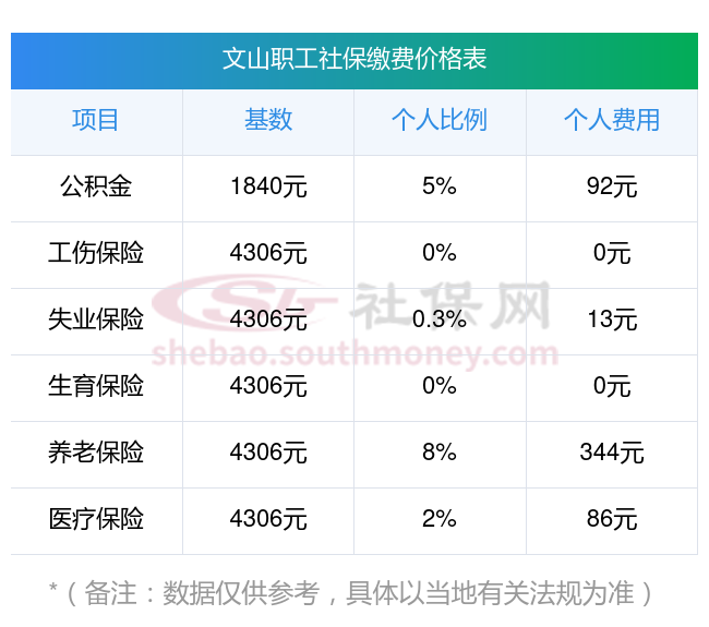 文山社保一个月交多少钱,个人缴纳多少钱一个月?下面和新社小编一起来看看文山最低标准社保费用明细参考,新社通app-社保缴费查询工具提供的最新数据如下: