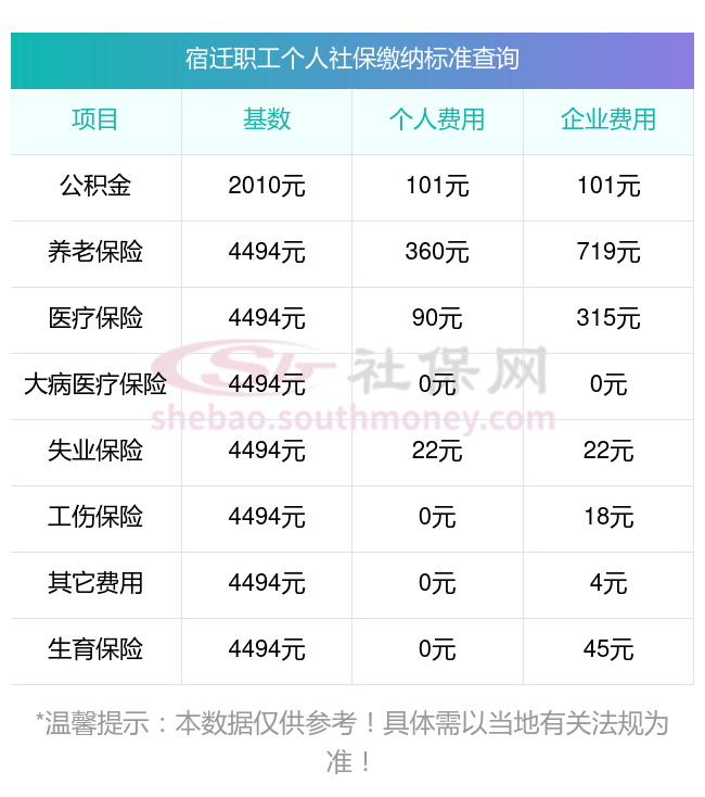 2025年宿迁社保缴费价格,2025年宿迁社保缴费多少钱?下表是2025年宿迁社保费用明细参考,新社通app-社保缴费查询工具提供的最新数据如下: