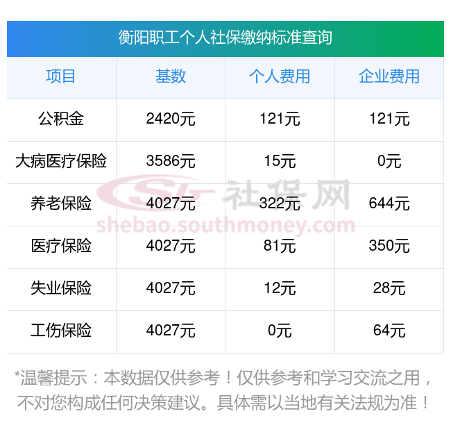 衡阳社保多少钱一个月?下面和社保丫丫一起来看看衡阳最低标准社保费用明细参考,新社通app-社保缴费查询工具提供的最新数据如下: