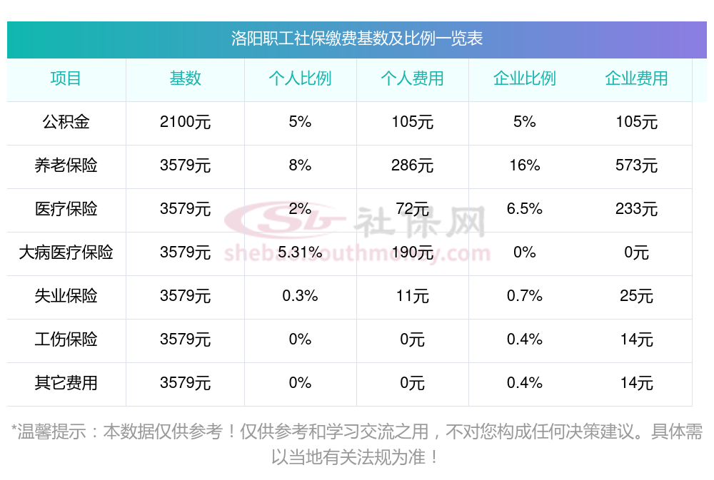 洛阳缴费社保比例一览 社保公司和个人各交多少?下表是2024-2025年洛阳社保费用明细参考,新社通app-社保缴费查询工具提供的最新数据如下: