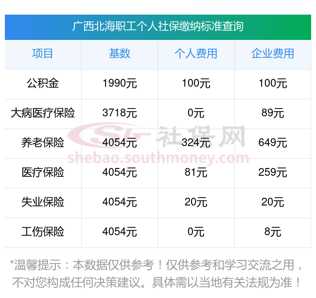 广西北海缴费社保比例一览社保公司和个人各交多少?下表是2024-2025年广西北海社保费用明细参考,新社通app-社保缴费查询工具提供的最新数据如下: