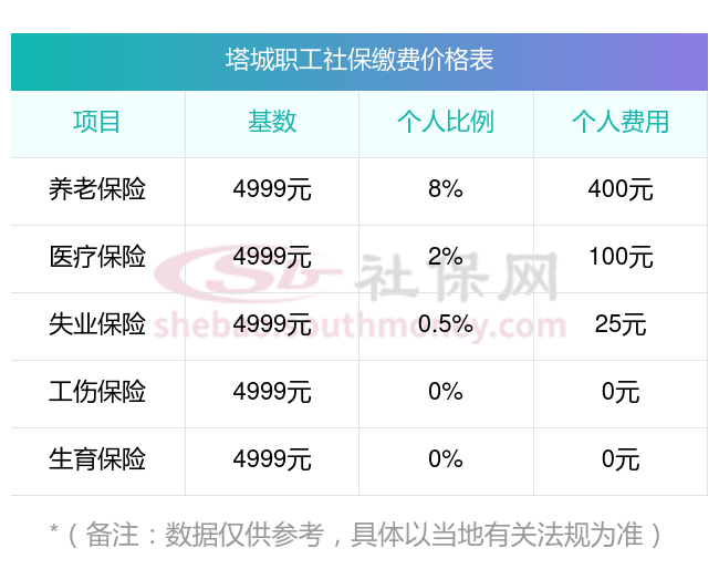 塔城缴费社保比例一览 社保公司和个人各交多少?下表是2024-2025年塔城社保费用明细参考,新社通app-社保缴费查询工具提供的最新数据如下: