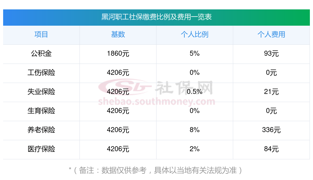 黑河缴费社保比例一览社保公司和个人各交多少?下表是2024-2025年黑河社保费用明细参考,新社通app-社保缴费查询工具提供的最新数据如下: