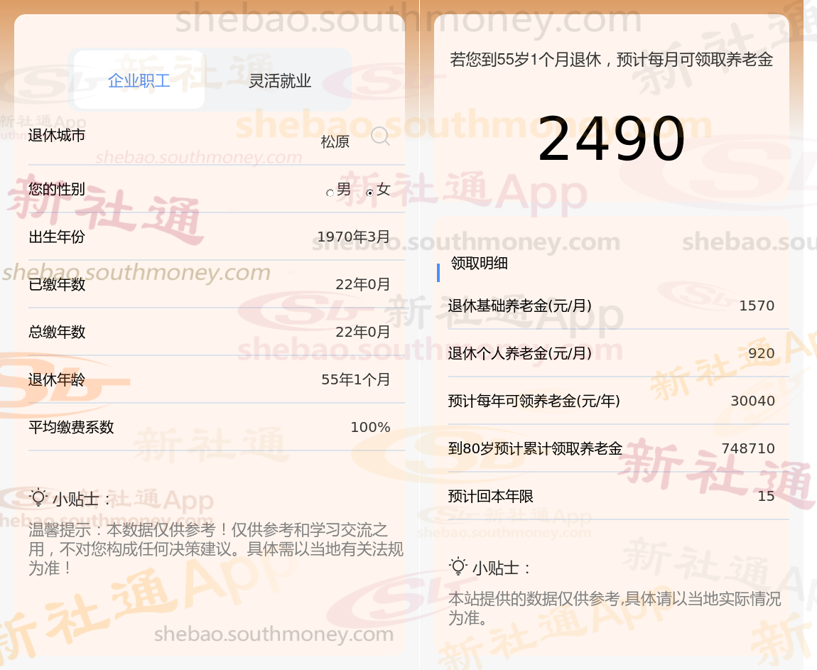 这是一名女性退休人员的档案:她1970年出生于松原,作为当地的退休人员,已缴纳社保22年,缴费档次为100%。