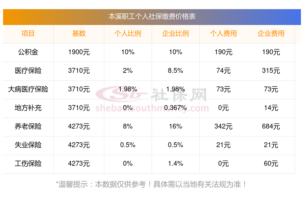 社保缴纳比例一览,社保公司和个人各交多少?下表是2023-2024年本溪社保费用明细参考,新社通app-社保缴费查询工具提供的最新数据如下: