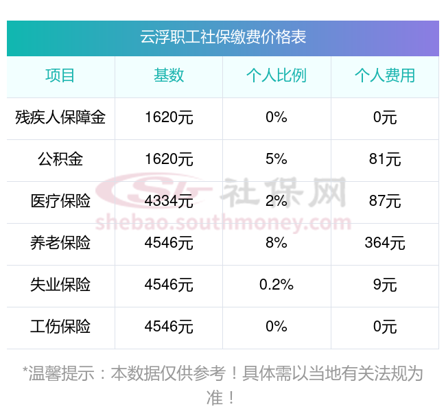职员五险一个月交多少钱公司加个人是多少?下表是2024-2025年云浮社保费用明细参考,新社通app-社保缴费查询工具提供的最新数据如下: