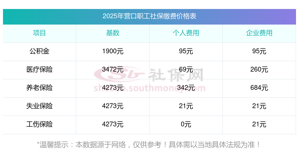 辽宁社保多少钱一个月?下表是2024-2025年营口社保费用明细参考,新社通app-社保缴费查询工具提供的最新数据如下: