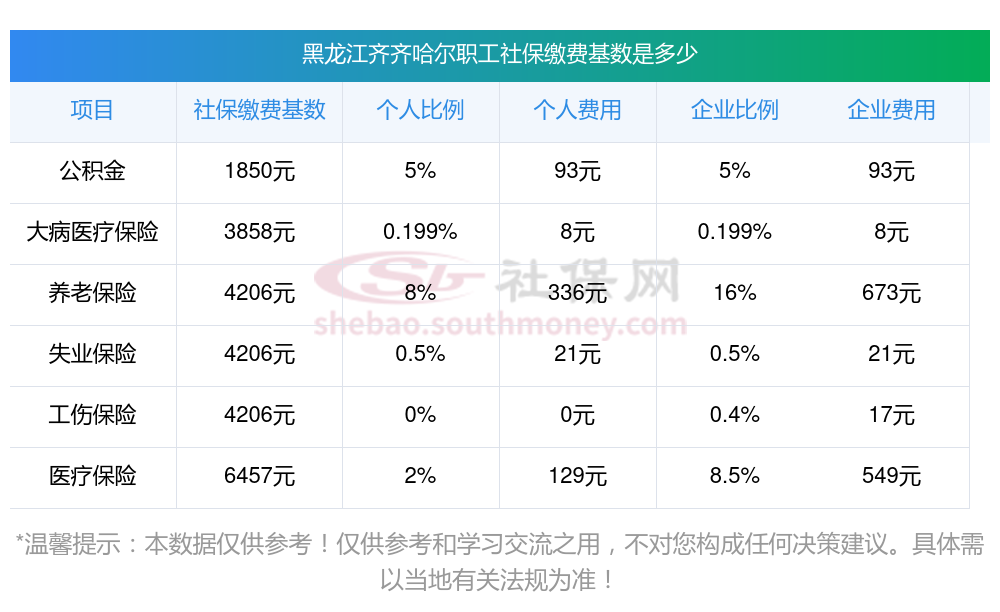 和社保丫丫一起来了解下:黑龙江齐齐哈尔社保缴费比例是多少?2024-2025年黑龙江齐齐哈尔社保费用明细参考,新社通app-社保缴费查询工具提供的最新数据如下: