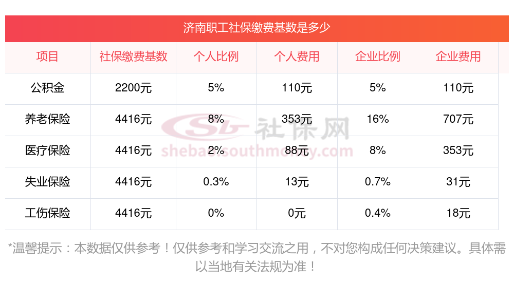 单位五险一个月交多少钱公司加个人是多少?下表是2024-2025年济南社保费用明细参考,新社通app-社保缴费查询工具提供的最新数据如下: