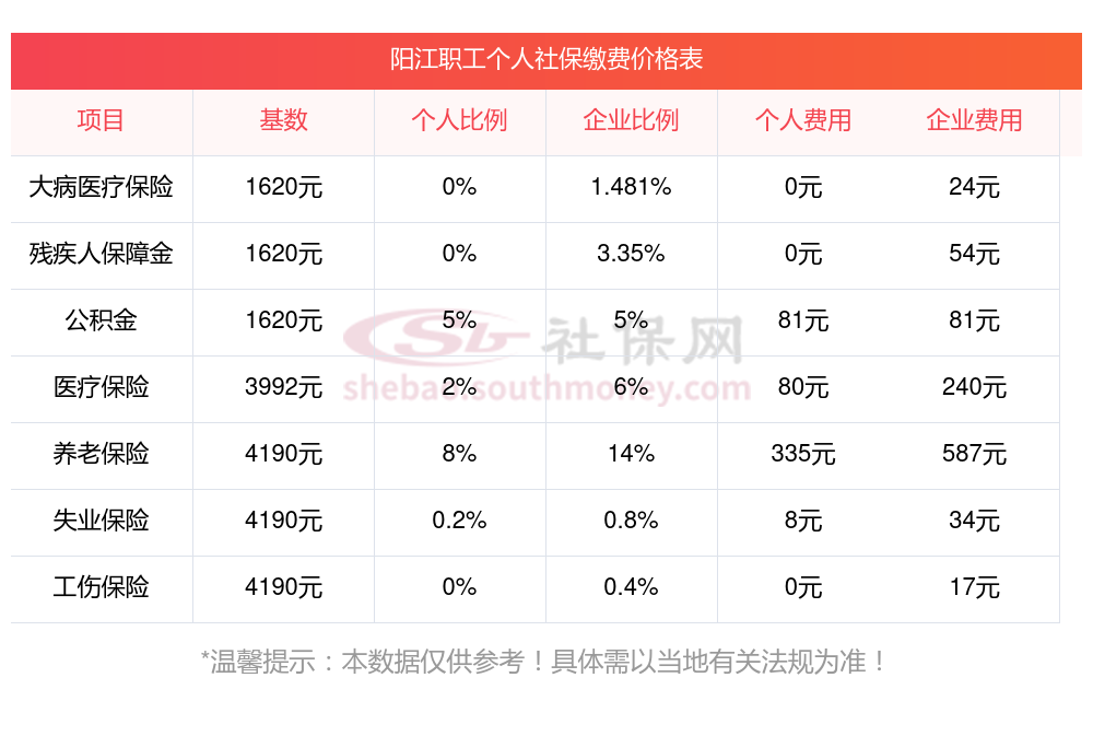 和新社通一起来了解下:阳江五险一金交多少钱一个月怎么算?2024-2025年阳江社保费用明细参考,新社通app-社保缴费查询工具提供的最新数据如下: