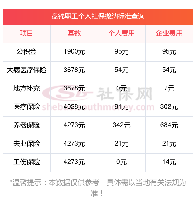 盘锦2025年养老保险缴费标准是多少?下表是2025年盘锦社保费用明细参考,新社通app-社保缴费查询工具提供的最新数据如下: