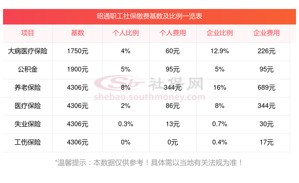 2025年昭通社保缴费多少钱?下表是2023-2024年昭通社保费用明细参考,新社通app-社保缴费查询工具提供的最新数据如下: