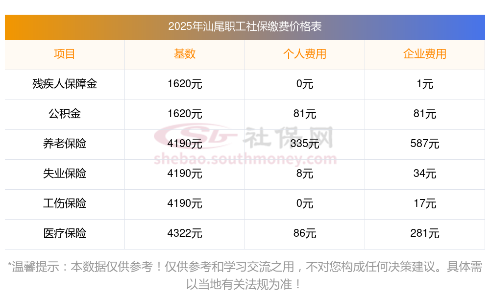 广东社保多少钱一个月?下表是2024-2025年汕尾社保费用明细参考,新社通app-社保缴费查询工具提供的最新数据如下: