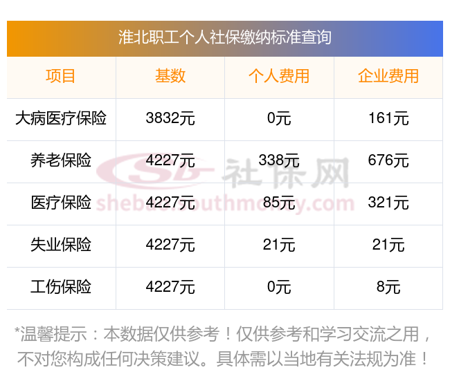 淮北最低配的五险一金自己交多少?下面和社保丫丫一起来了解下2024-2025年淮北最低配社保费用明细参考,新社通app-社保缴费查询工具提供的最新数据如下: