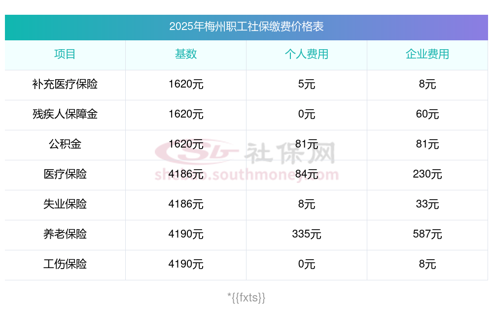 上班族五险一个月交多少钱公司加个人是多少?下表是2024-2025年梅州社保费用明细参考,新社通app-社保缴费查询工具提供的最新数据如下: