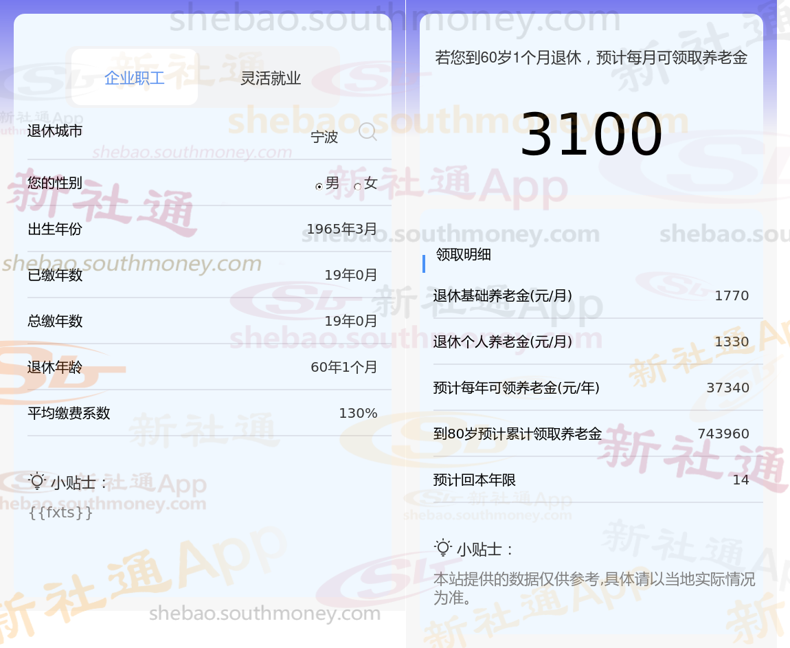 个人基础信息:男性,1965年出生,宁波退休人士,拥有19年的缴费年限,缴费档次为130%。