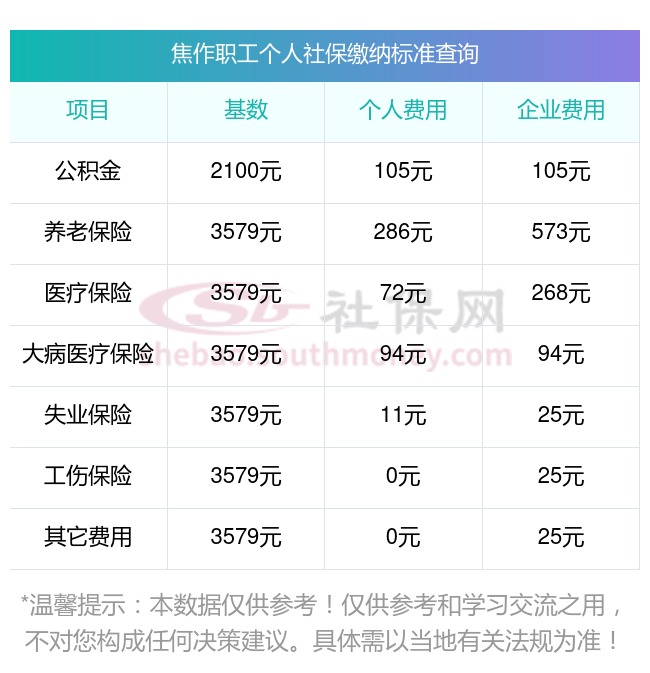2025年焦作社保缴费多少钱?下表是2024-2025年焦作社保费用明细参考,新社通app-社保缴费查询工具提供的最新数据如下:
