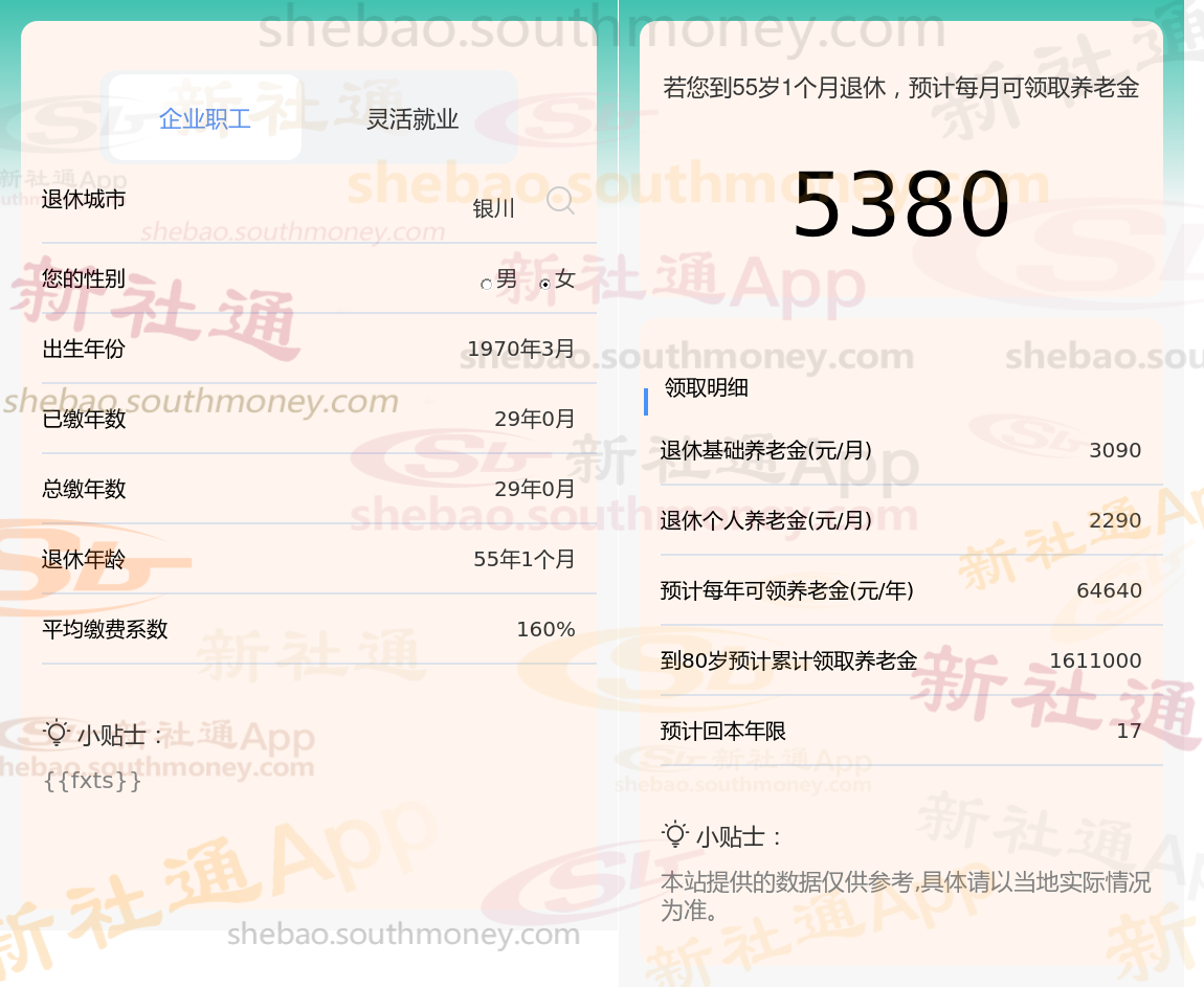 个人档案:女性,1970年出生,银川退休职工,社保缴费29载,档次160%。
