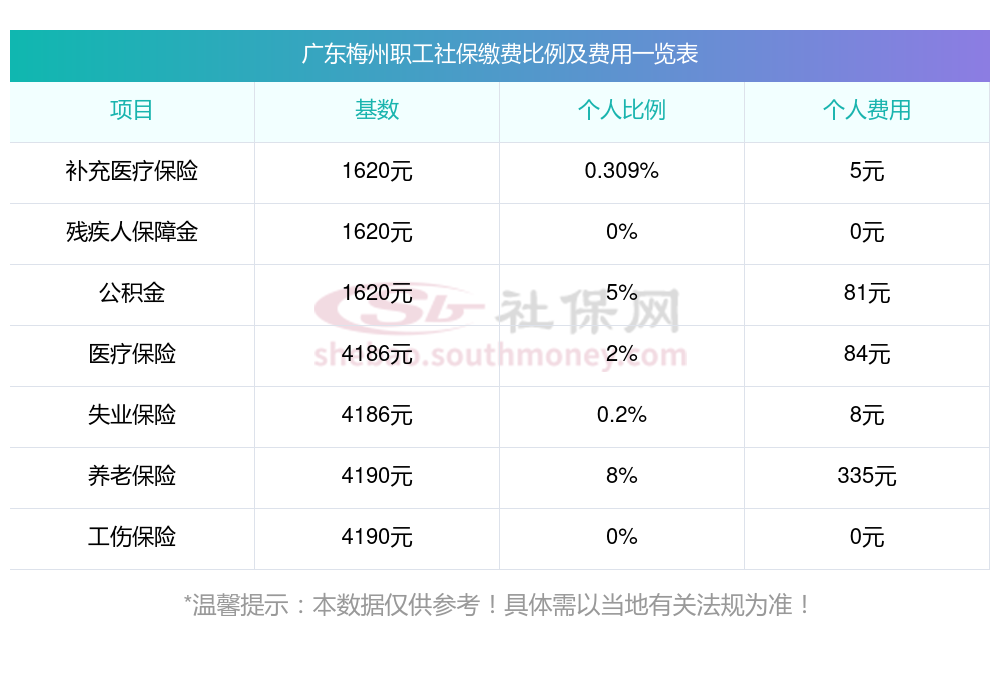 2025年广东梅州社保缴费最低基数及个人和单位具体是多少钱?下表是2025年广东梅州社保费用明细参考,新社通app-社保缴费查询工具提供的最新数据如下: