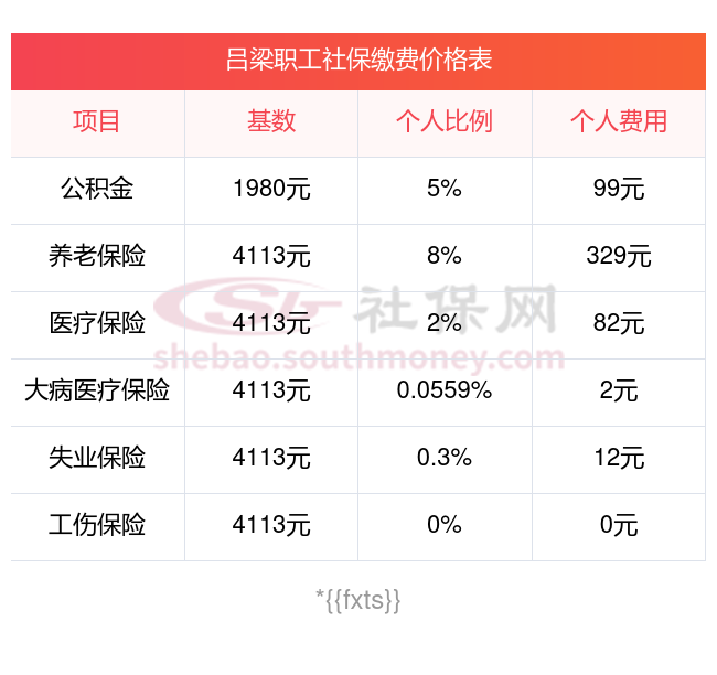 2025年吕梁5险缴费标准,2025年吕梁社保缴费多少钱?下表是2025年吕梁社保费用明细参考,新社通app-社保缴费查询工具提供的最新数据如下: