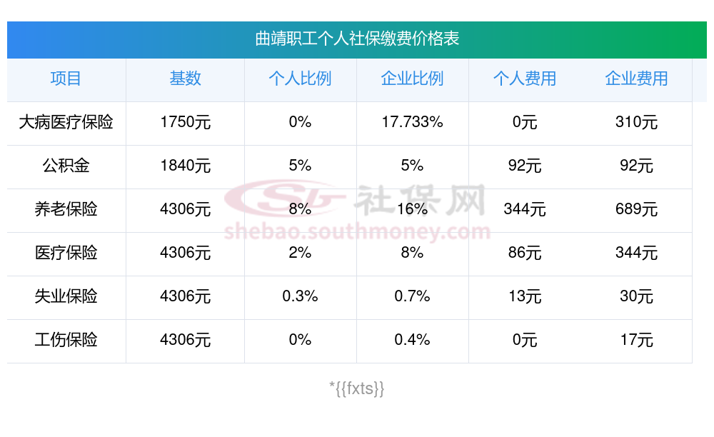 曲靖缴费社保比例一览 社保公司和个人各交多少?下表是2024-2025年曲靖社保费用明细参考,新社通app-社保缴费查询工具提供的最新数据如下: