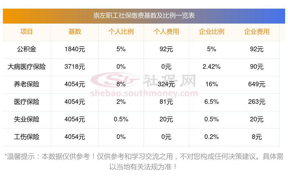 2025年崇左社保缴费最低基数及个人和单位具体是多少钱?下表是2025年崇左社保费用明细参考,新社通app-社保缴费查询工具提供的最新数据如下:
