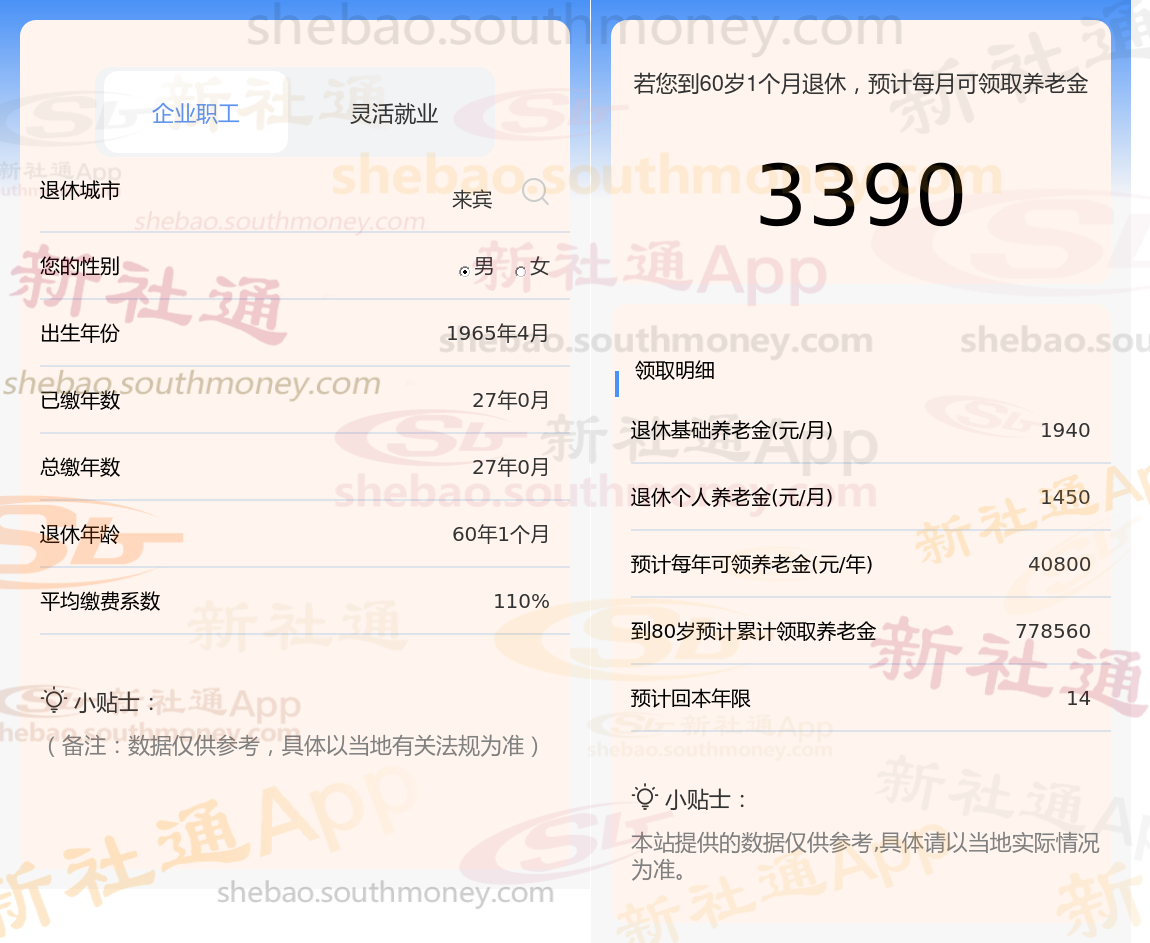 个人档案:男性,1965年出生,来宾退休职工,社保缴费27载,档次110%。