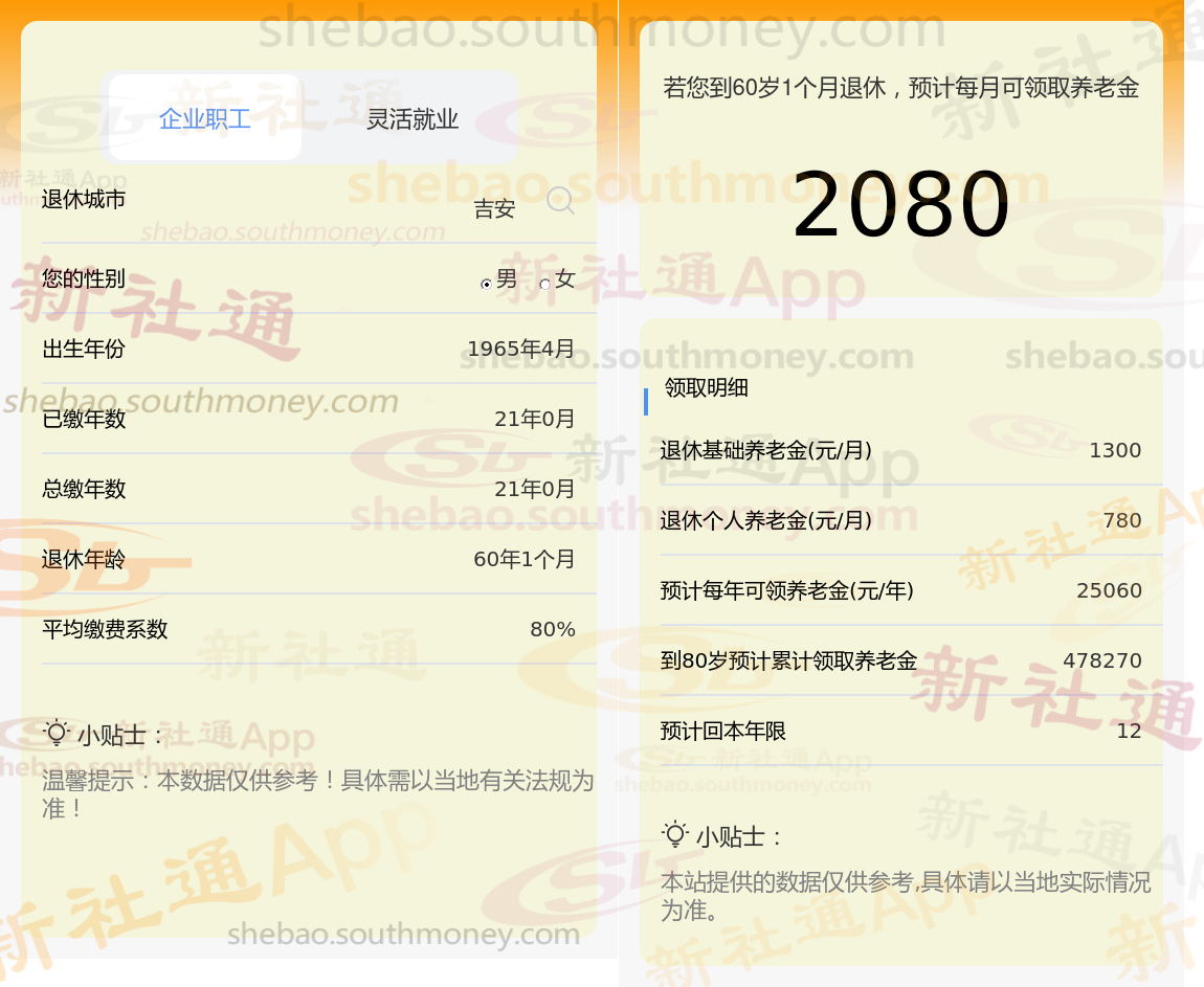 柯某,吉安人,1965年出生,是一名拥有21载社保缴费年限的退休男性,缴费档次稳定在80%。岁月流转,他终于迎来了自己的退休时光。借助新社通app养老金在线计算器计算所得: