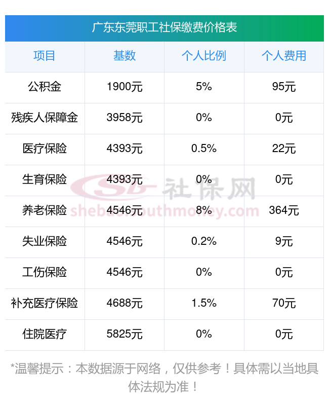 广东东莞社保各基数的缴费比例是多少?和社保丫丫一起来看看,新社通app-社保缴费查询工具提供的最新数据如下: